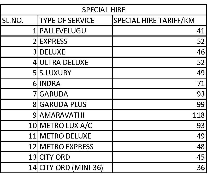 Various types of buses i.e., Super Luxury, Deluxe, Express, Palle Velugu and City will be made available to the public on hire basis. Hire charges will be calculated on hire basis or distance basis whichever is higher. The hours will be converted into KMs for calculation of special hire amount. The hourly chargable KMs irrespective of day and night and peak and slack seasons the uniform KMs of 20 per hour. The minimum chargeable distance is 330 KMs duruing all seasons. The amount will be collected in advance. |